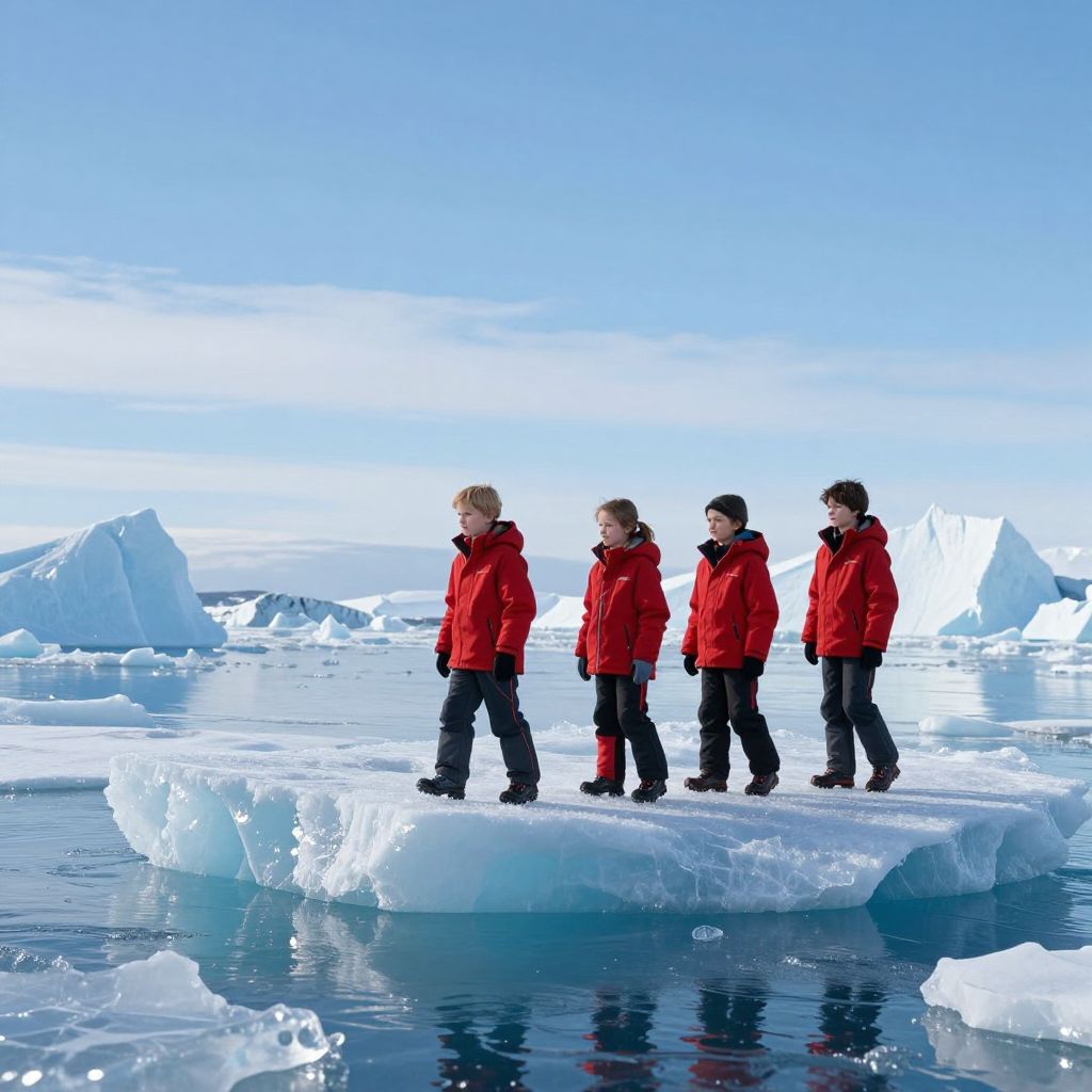 Photograph of four children in red jackets standing on a large ice floe, surrounded by icebergs and blue icy water under a clear sky.