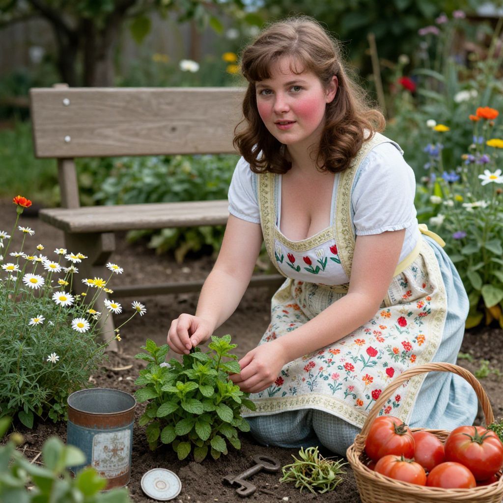 Natural light photograph of a 1930s-era gardener woman with a youthful face, rosy cheeks, and wavy chestnut hair, dressed in a hand-finished floral apron with small red and white tulips stitched into it, kneeling in a flower-filled garden with a small wooden bench in the background, tending to a patch of mint and chamomile, surrounded by vintage tin cans, a garden key, and a basket of ripe tomatoes, capturing the authentic charm and rustic beauty of 1930s cottagecore gardening.. The woman has big tits and cute face
