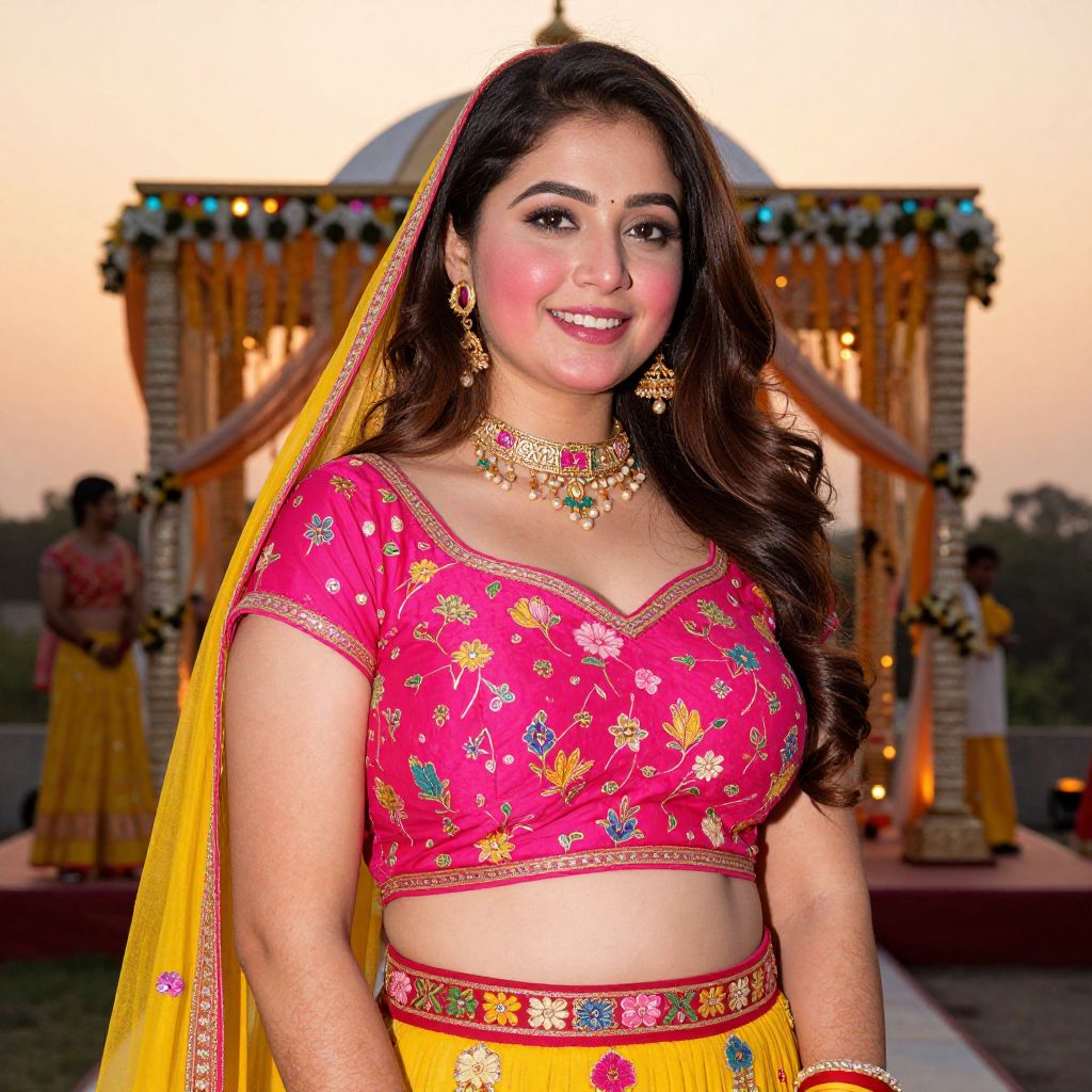 A realistic close-up of an Indian wedding guest in a vibrant pink and yellow choli and salwar set, wearing a floral embroidered skirt and a red waist belt, standing in front of a traditional wedding mandap under a sky with golden evening hues, the woman has a radiant smile, rosy cheeks, and sharp, expressive eyes with natural makeup, caught in a moment of celebration during the wedding reception.. The woman has big tits and cute face