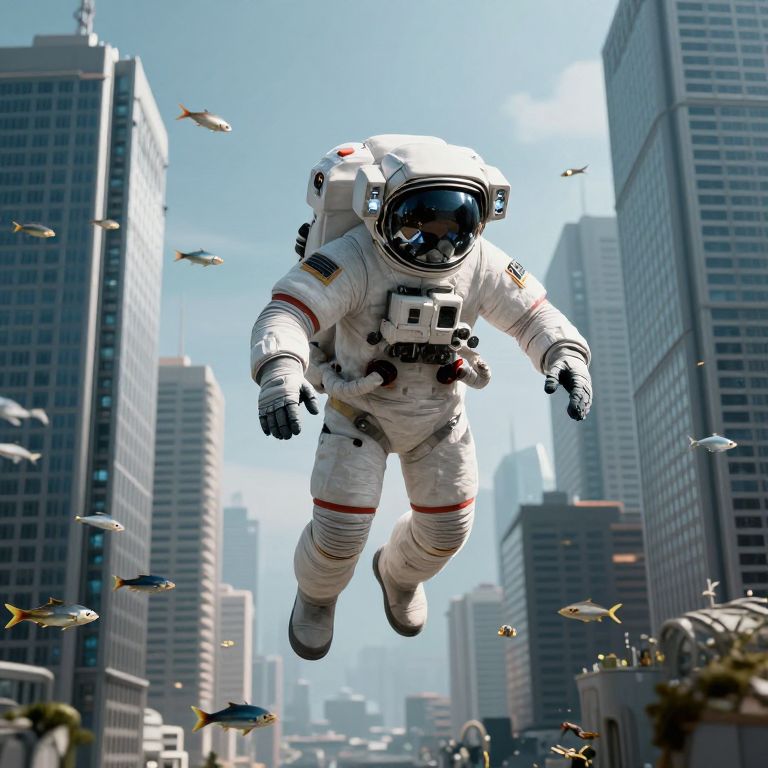 A surreal 3D-rendered scene depicts an astronaut floating in zero gravity between towering skyscrapers, surrounded by schools of flying fish, blending cyberpunk aesthetics with dreamlike, high-definition visuals that evoke a sense of abandonment and otherworldly wonder.