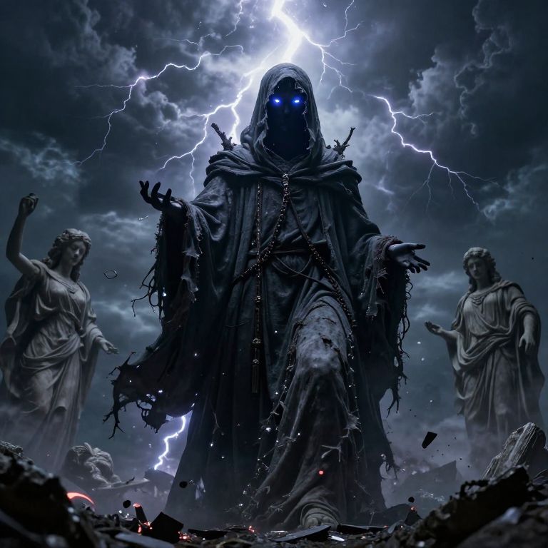 Digital art: Dark, hooded figure with glowing blue eyes stands amid lightning, surrounded by shattered statues and a stormy sky.