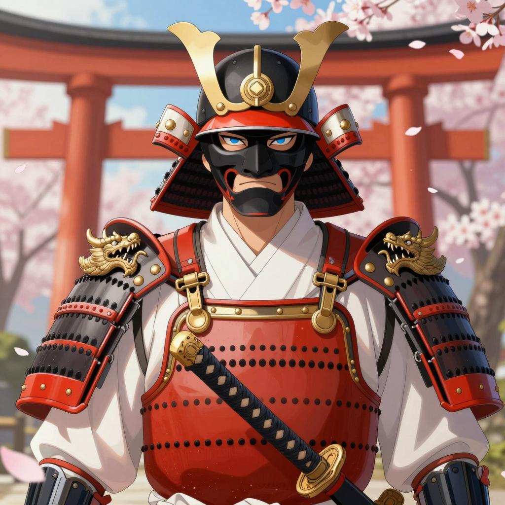 Illustration of a white-haired samurai with blue eyes, wearing red and gold armor, a black mask with red and gold decorations, and a white tunic. Samurai has dual dragon shoulder pauldrons, a sheathed katana across the chest, and cherry blossom petals in the background. Torii gate in the background. Samurai stands facing forward with neutral expression.