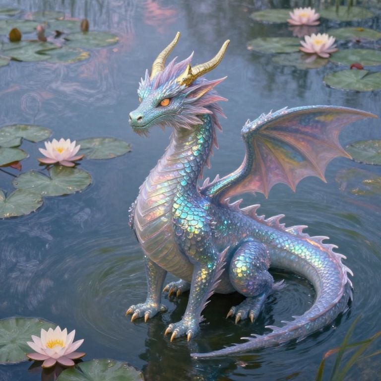 A captivating digital art portrait portrays an enigmatic mythical creature, a dragon with shimmering scales, standing proudly amidst a tranquil landscape reminiscent of Monet's Water Lilies. The dragon's radiant eyes convey an aura of ancient wisdom as it surveys its environment from an unconventional bird's-eye viewpoint, highlighting its regal stature and graceful demeanor. This scene seamlessly merges elements of fantasy and natural splendor, evoking a deep sense of wonder and serenity that beckons viewers to delve into the enchanting allure of this otherworldly domain.