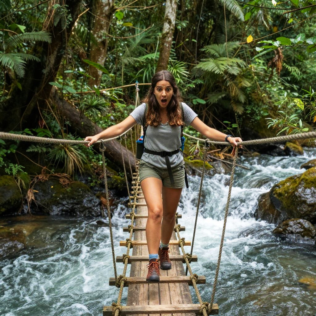 Photograph of a young woman with long brown hair and light olive skin, standing on a wooden suspension bridge over a fast-flowing river in a lush, dense jungle. She wears a gray t-shirt, olive green shorts, and red hiking shoes, gripping the bridge's ropes with both hands. Her mouth is slightly open in a surprised expression. The background is rich with green foliage, ferns, and trees, creating a vibrant, natural setting. The river below is turbulent, with white water cascading over rocks. The image has a vivid, slightly exaggerated color style.