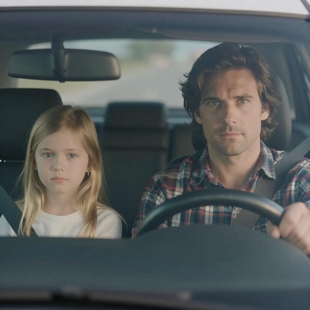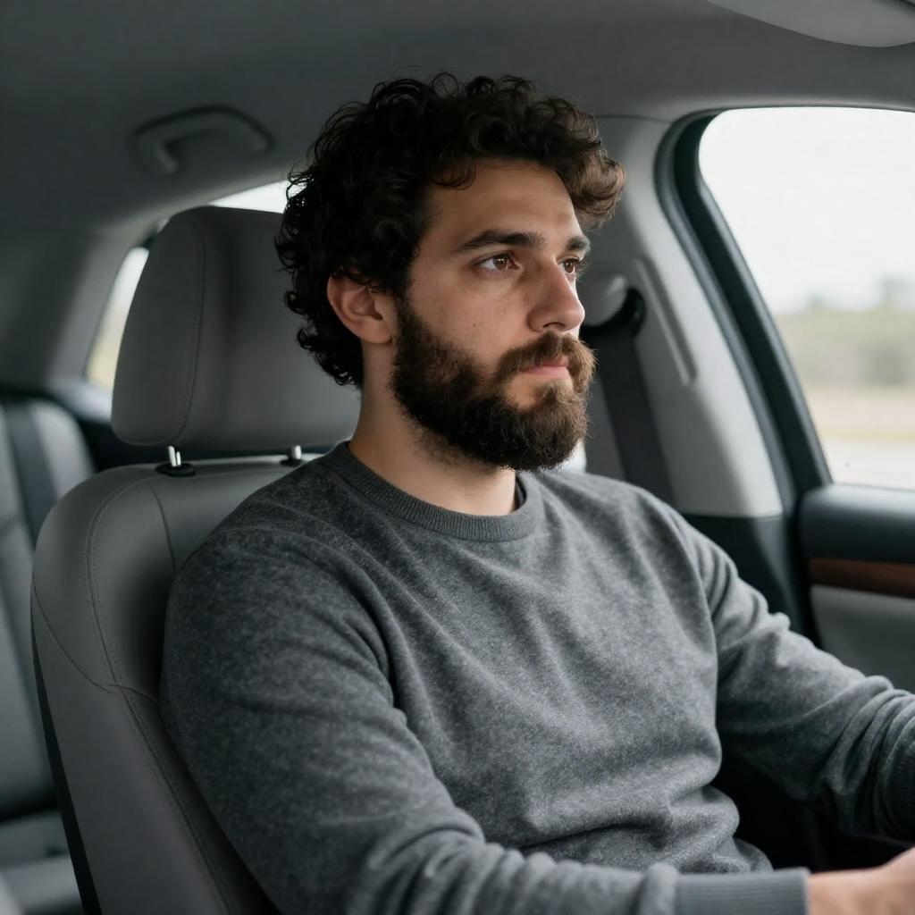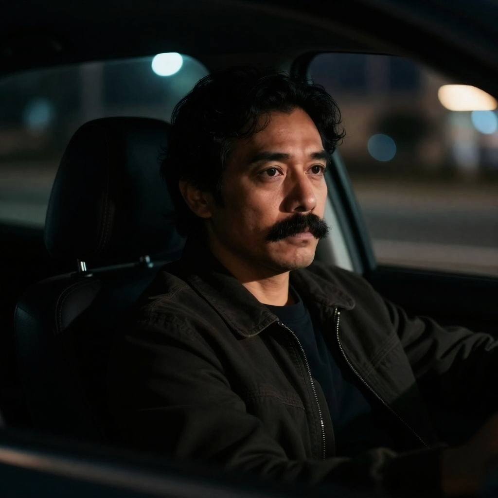 Digital illustration of a bearded man with medium-length black hair, wearing a brown jacket and white shirt, driving at night. He has a focused expression, looking to the right. Blurred city lights in the background. Dark car interior. Man's head slightly tilted forward.