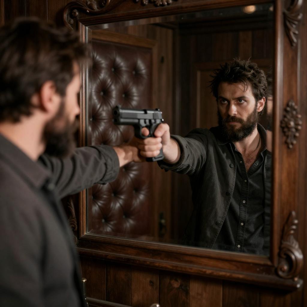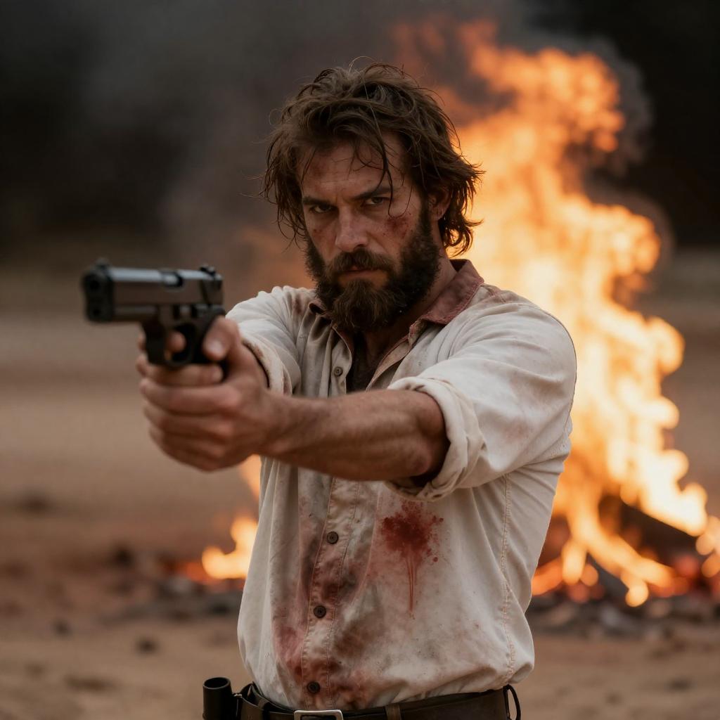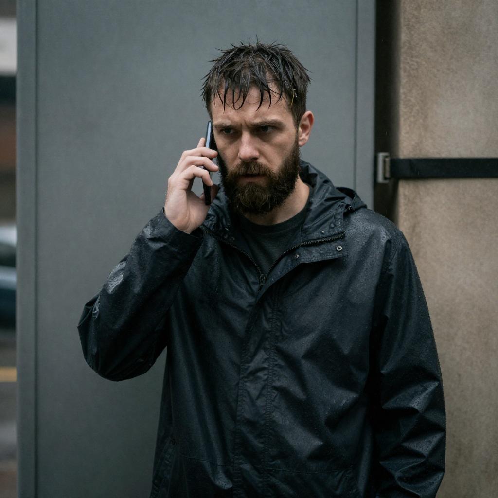 Bearded man with wet hair pointing a handgun forward. He wears a dark, patterned jacket over a white tank top. Rain falls around him. Background includes blurred greenery and metal structures. Intense gaze, slight smirk. Upper body shot.