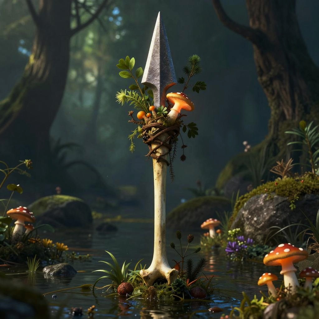 Shrek weapon concept art, a bone and stone spear adorned with swamp herbs and luminous mushrooms, fantasy theme with moody lighting and rich textures, atmospheric swamp setting, cinematic perspective