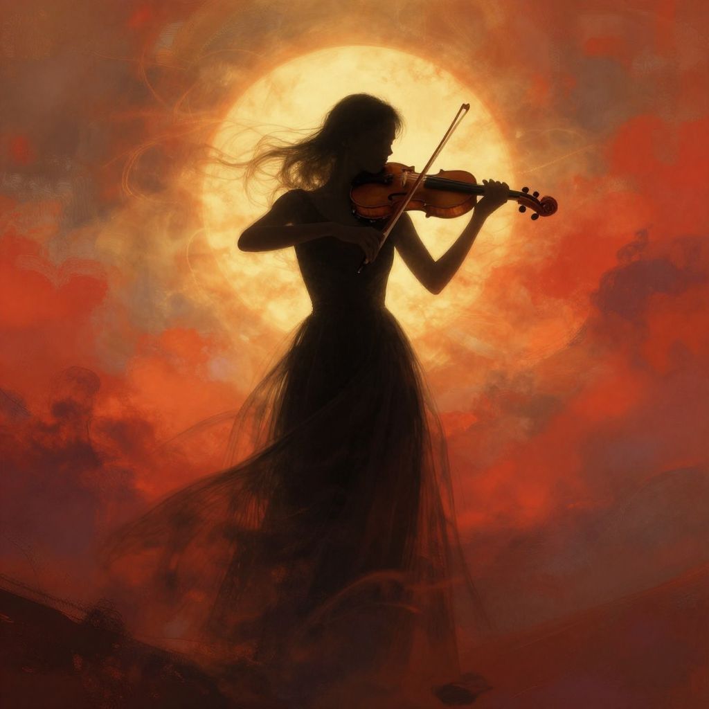 An ethereal digital illustration captures a silhouette of a woman in a flowing black dress, playing a violin bathed in warm, golden-hour light, as vibrant red and orange hues radiate around her, evoking a melancholic yet emotive atmosphere.