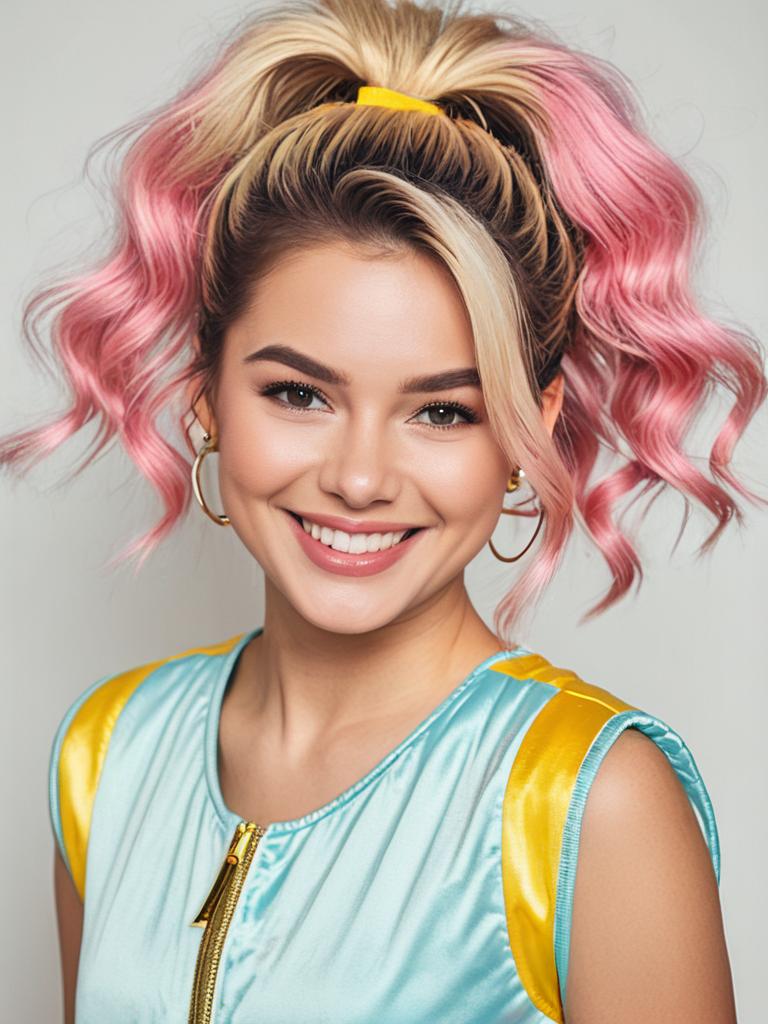 Girl in Pop Star Costume, close-up cheerful headshot with styled hair --sref 1400