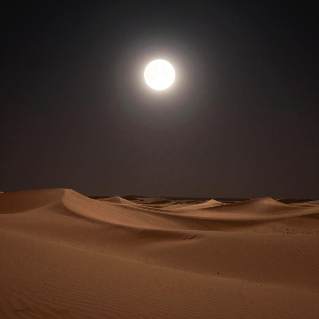 Eclipse sky, peaceful desert vista during a solar eclipse, sand dunes bathed in the moon’s shadow, starfield evident above, warm muted colors, a mystical and serene environment