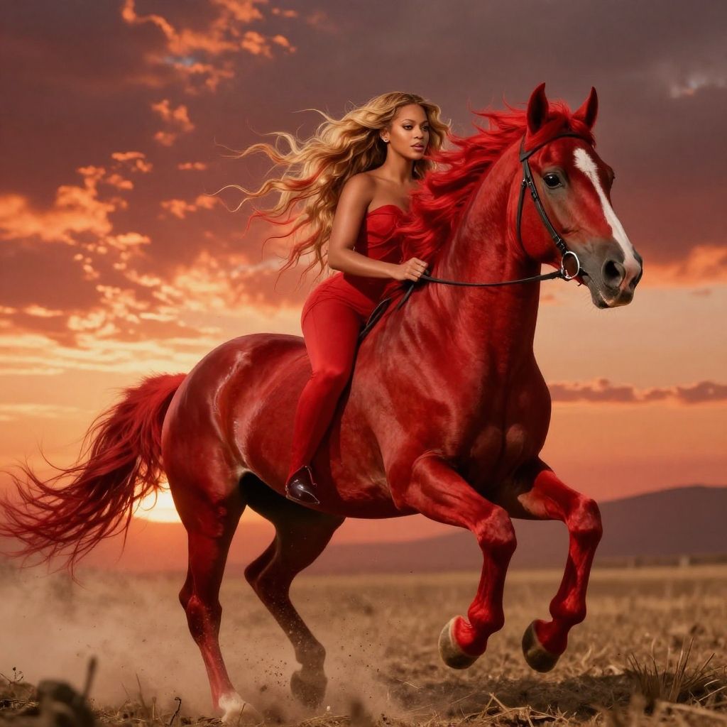 Beyonce red horse galloping through a fiery sunset, vibrant red mane flowing, dramatic lighting, fantasy style, highly detailed, dynamic energy, cinematic composition