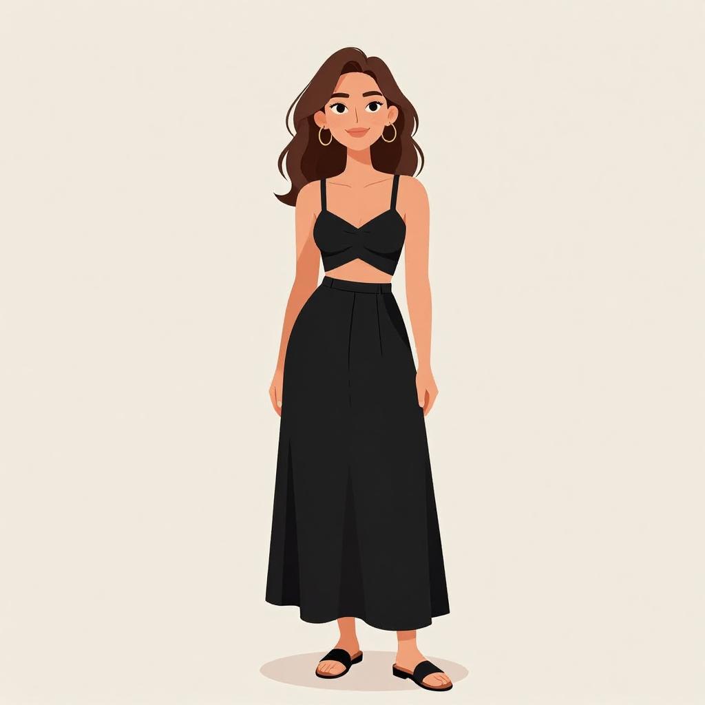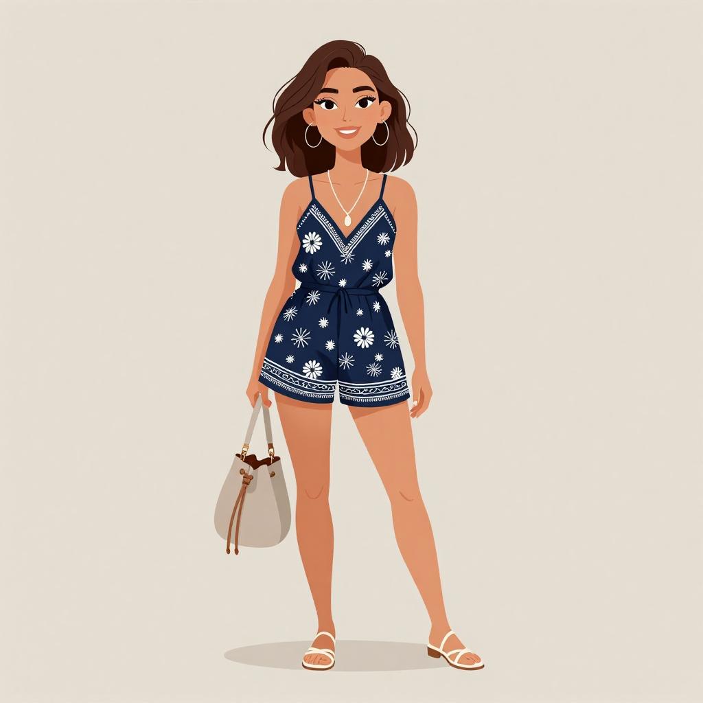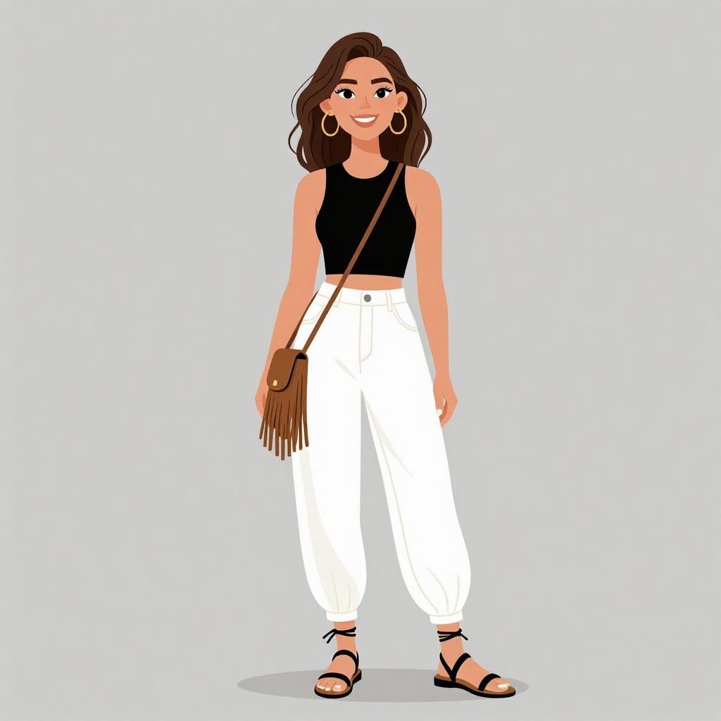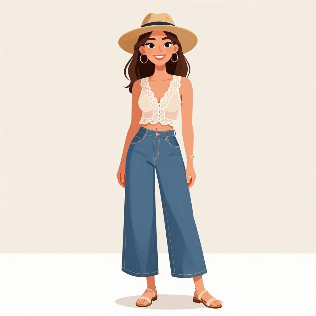 Woman with pretty face and pretty hair. smiling Woman, casual chic, white crop top with a crew neck, sleeveless, matching high-waisted palazzo pants with a drawstring waist, tan open-toe flat sandals, large woven tote bag, minimalist gold necklace, subtle stud earrings, loose wavy hair, sunglasses resting on head, studio background with a neutral color palette. --sref 1467