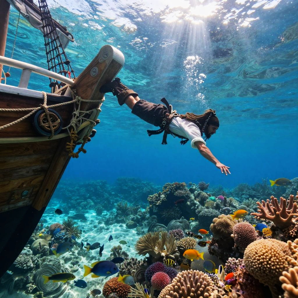 Fantasy pirate overboard scene, a daring figure diving off a wooden ship into crystal clear tropical waters teeming with colorful coral reefs and exotic fish, vibrant sunlight filtering through water, adventurous and dynamic composition