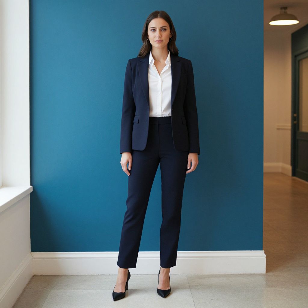 Photograph of a tall, slender woman with long dark brown hair standing against a blue wall. She wears a black blazer, white button-up shirt, and black cuffed trousers, paired with black high-heeled shoes. Her expression is neutral, and she stands with her arms relaxed at her sides. The background includes a white baseboard, a white window sill, and an open doorway leading to a beige hallway. The lighting is bright, highlighting her professional, business-casual attire. The overall style is modern and minimalistic.