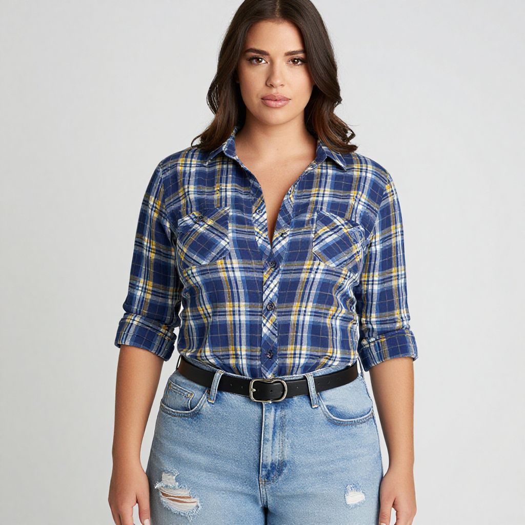 "Woman, casual, blue and yellow plaid shirt with rolled-up sleeves, two chest pockets, light-wash ripped denim jeans, black belt with a simple buckle.. Sexy. Pretty face and beаutiful eyes. Big breasts."