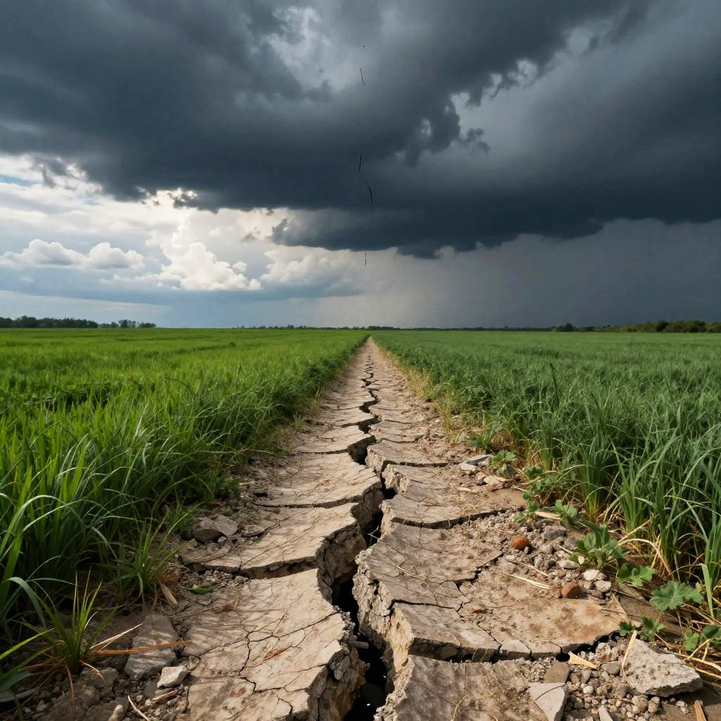 Photograph of a cracked, sunken dirt path stretching into the distance, flanked by lush green grass on both sides. The sky above is dramatic, with dark, stormy clouds on the right and lighter, partially cloudy skies on the left, creating a stark contrast. The path's texture is rough and cracked, with visible fissures running through it. The horizon is flat, with distant, barely visible trees on the left. The overall mood is tense and foreboding, suggesting an impending storm. The image has high contrast and vivid colors, emphasizing the natural elements and weather conditions.