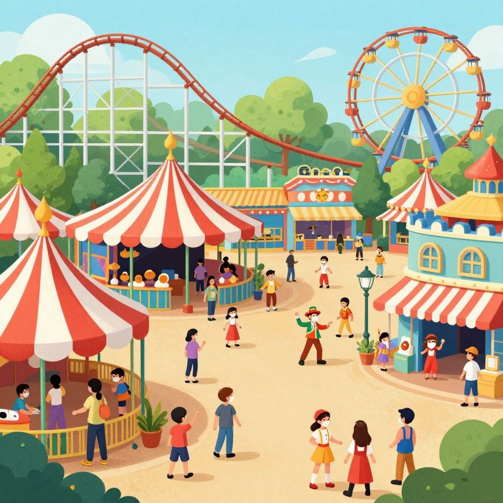 Colorful cartoon-style illustration of a bustling theme park with numerous people, red and white striped tents, a roller coaster, a Ferris wheel, and lush green trees. The lively scene includes children wearing masks, animated street performers, and detailed buildings, creating a playful and energetic atmosphere with vibrant colors and whimsical charm.