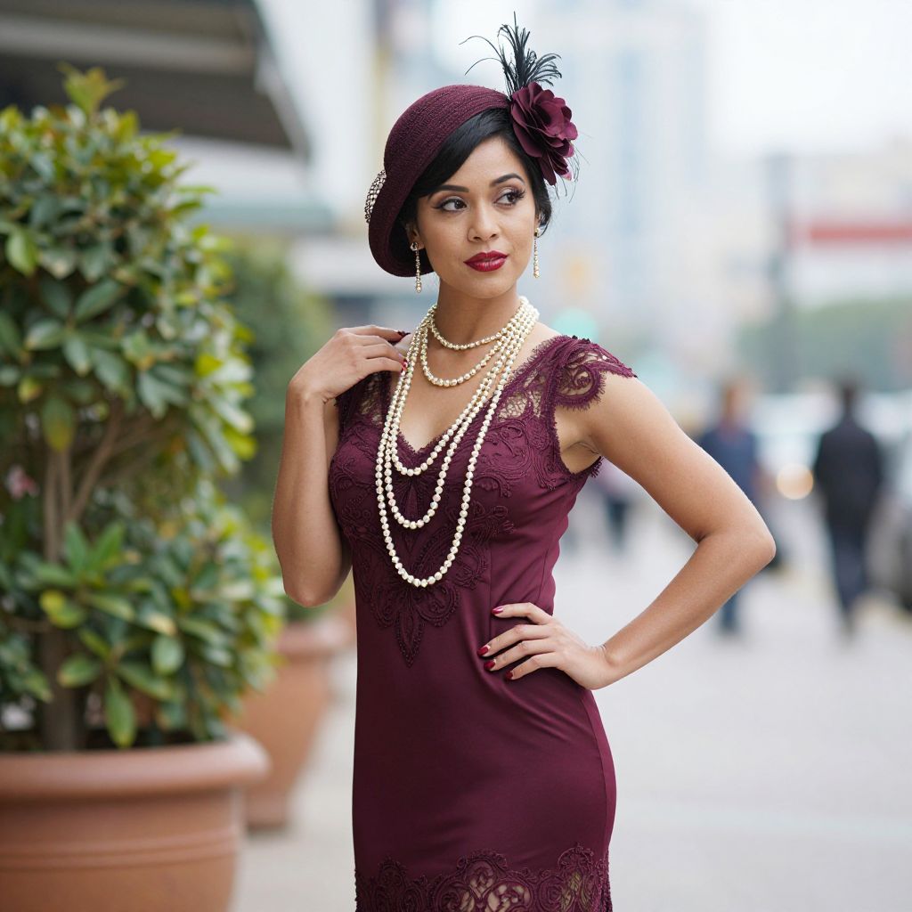 Elegant woman wearing a burgundy flapper costume with lace detailing, a matching hat adorned with a floral accessory, and layered pearl necklaces, posing confidently outdoors with a potted plant to her left and blurred urban scenery in the background.