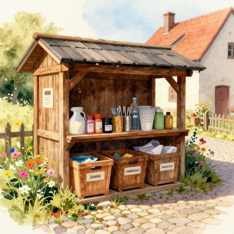Sammelstelle in a rustic village setting, wooden bins labeled for different materials, surrounded by blooming wildflowers and cobblestone paths, soft golden hour lighting, warm and inviting atmosphere, highly textured watercolor style