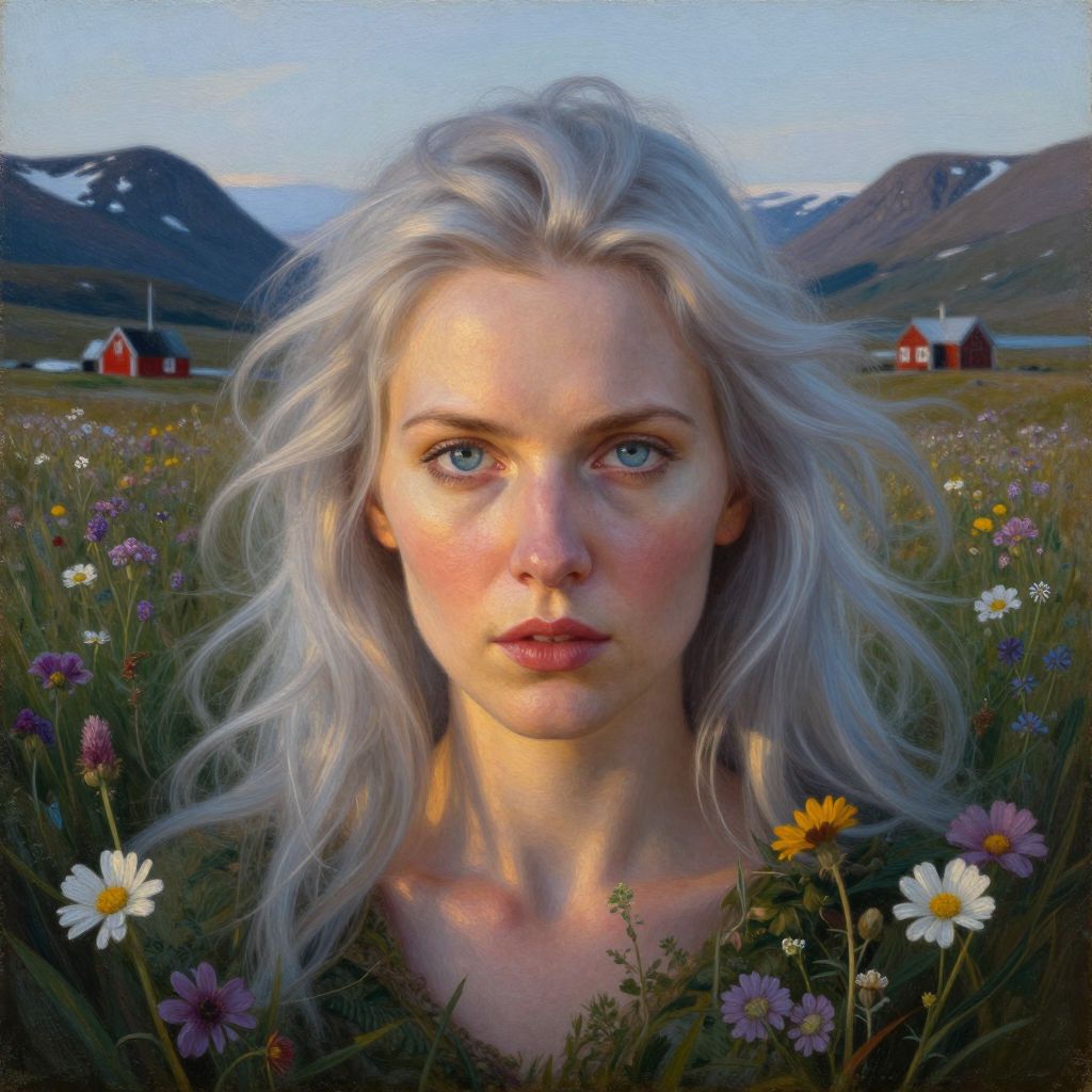 A photorealistic portrait depicts an enigmatic European woman with piercing ice-blue eyes and flowing silver hair, bathed in the soft golden light of her homeland's midnight sun. From a unique 'above' perspective, her gaze is intense as she stands amidst a sea of vibrant wildflowers, their petals swaying gently in the ethereal glow. The hyperrealistic oil painting style emphasizes intricate details—her alabaster skin and chiseled features illuminated by subtle plays of light. This portrait evokes an emotional spectrum ranging from awe to intrigue, drawing viewers into the captivating enigma of her presence amidst a breathtaking Arctic landscape.