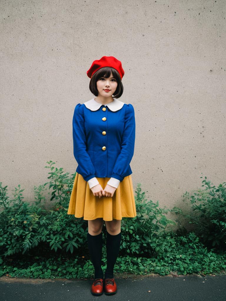 Full-body photo of an Asian young woman cosplaying as Adeline. She has short black hair and blue eyes, wearing a blue long-sleeve jacket with gold buttons, a white Peter Pan collar and cuffs, a mustard yellow skirt, black knee-high socks, and brown shoes. She is also wearing a red beret, standing outdoors against a gray textured wall with green foliage at the base.