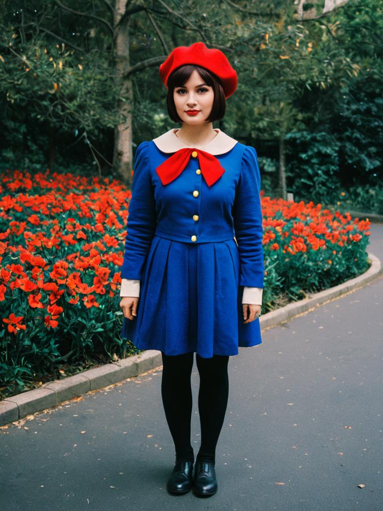 Photo-realistic cosplay photo of person in adeleine costume. 1girl, blue eyes, short hair, black hair, brown hair, red headwear, long sleeves, palette (object), beret, red hat. full body shot