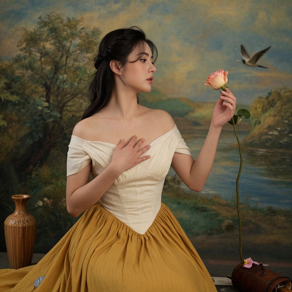 Photograph of an Asian woman in a white off-shoulder top and golden skirt, holding a pink rose, with a bird flying by a painted
