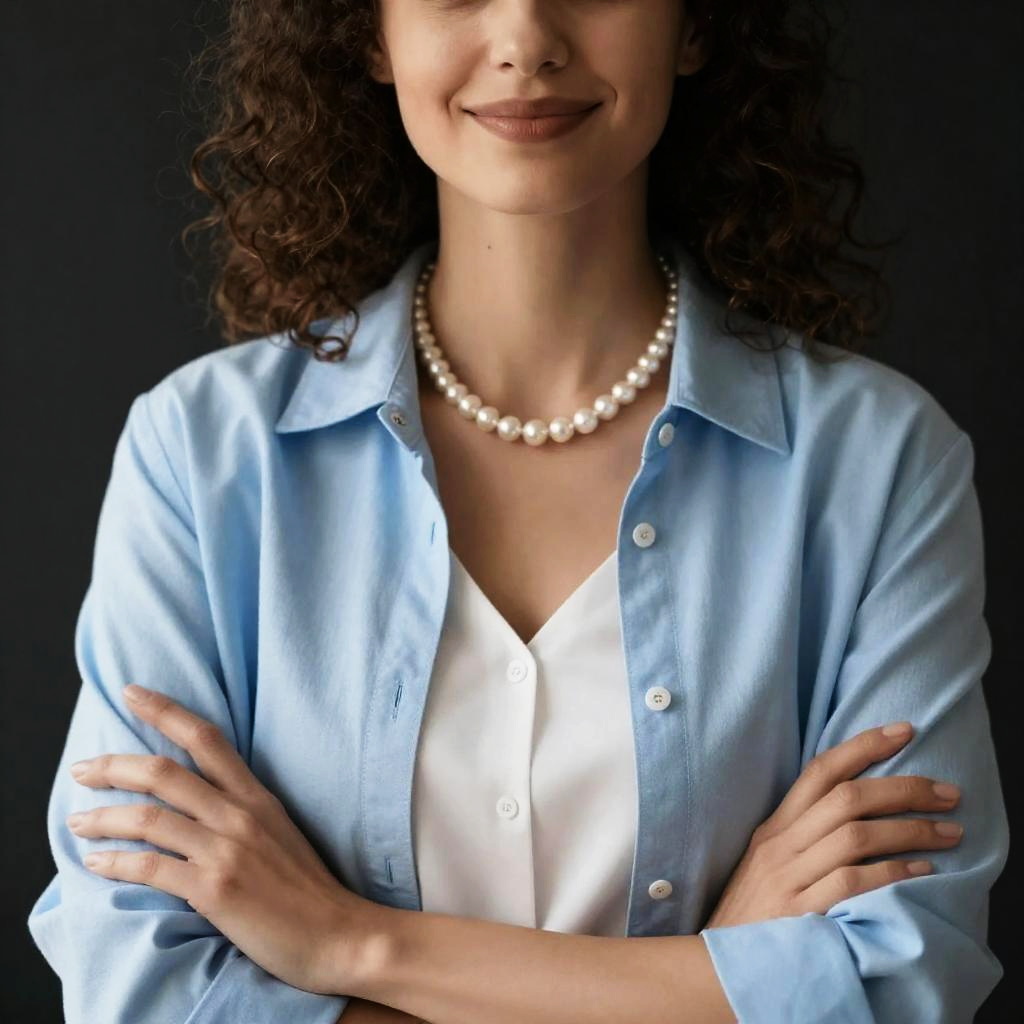 Photograph of a woman with curly brown hair, wearing a striped white shirt over a gray top, holding a pen. She has a neutral expression, standing in front of a colorful map. Lanyard with an ID badge around her neck. Background includes a map with green and blue areas. She is centered in the frame.
