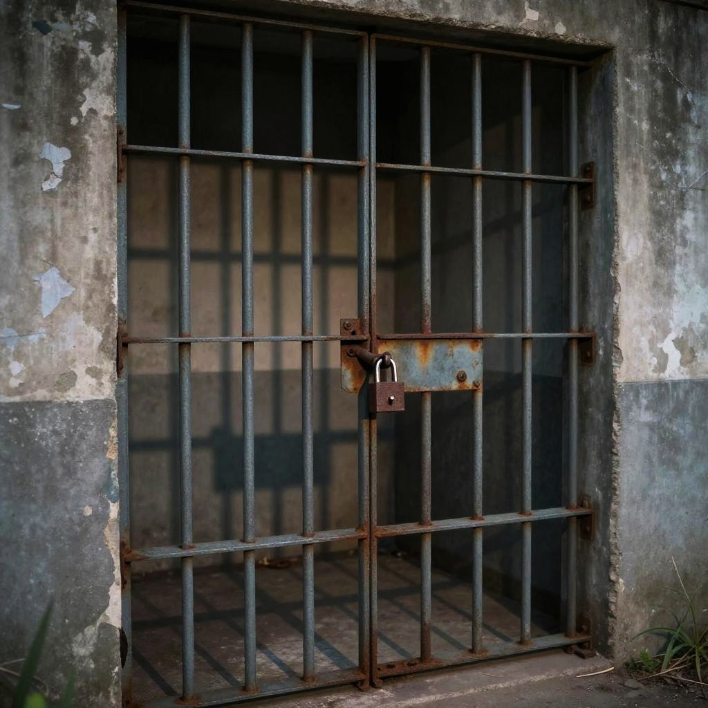 Picture of a jail at dusk, cold steel bars and dim lighting casting long shadows, rusty locks and peeling paint on concrete walls, a lonely atmosphere evoking isolation and confinement, detailed textures and moody color palette