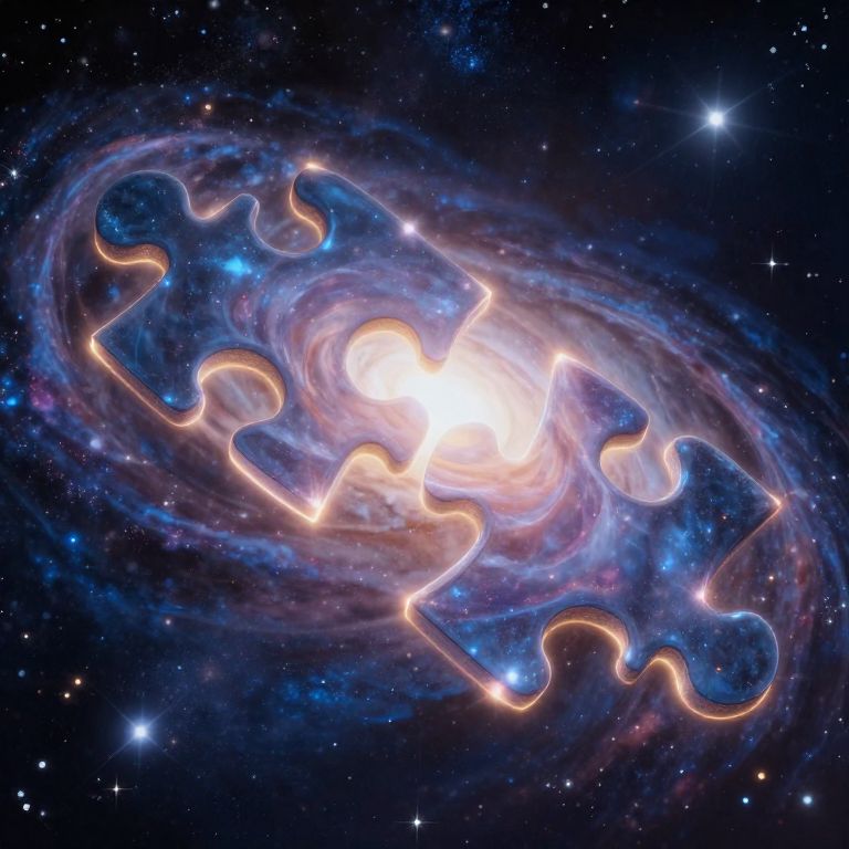 Giant interlocking puzzle pieces float serenely against a cosmic backdrop, their edges glowing with radiant light as they weave through swirling galaxies and starfields, defying the boundaries between matter and the infinite void.