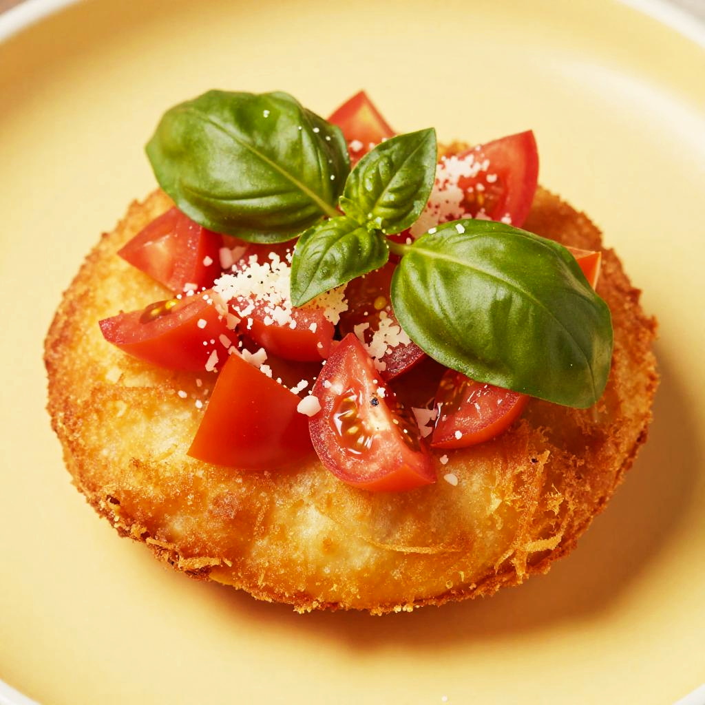 Close-up photo of a bite-sized, golden-brown fried dough topped with fresh green basil leaves, diced red tomatoes, and a sprinkle of cheese. The dough has a crispy texture, and the bright colors of the tomatoes and basil contrast with the yellow plate underneath. The background is slightly blurred, focusing attention on the appetizing topping.