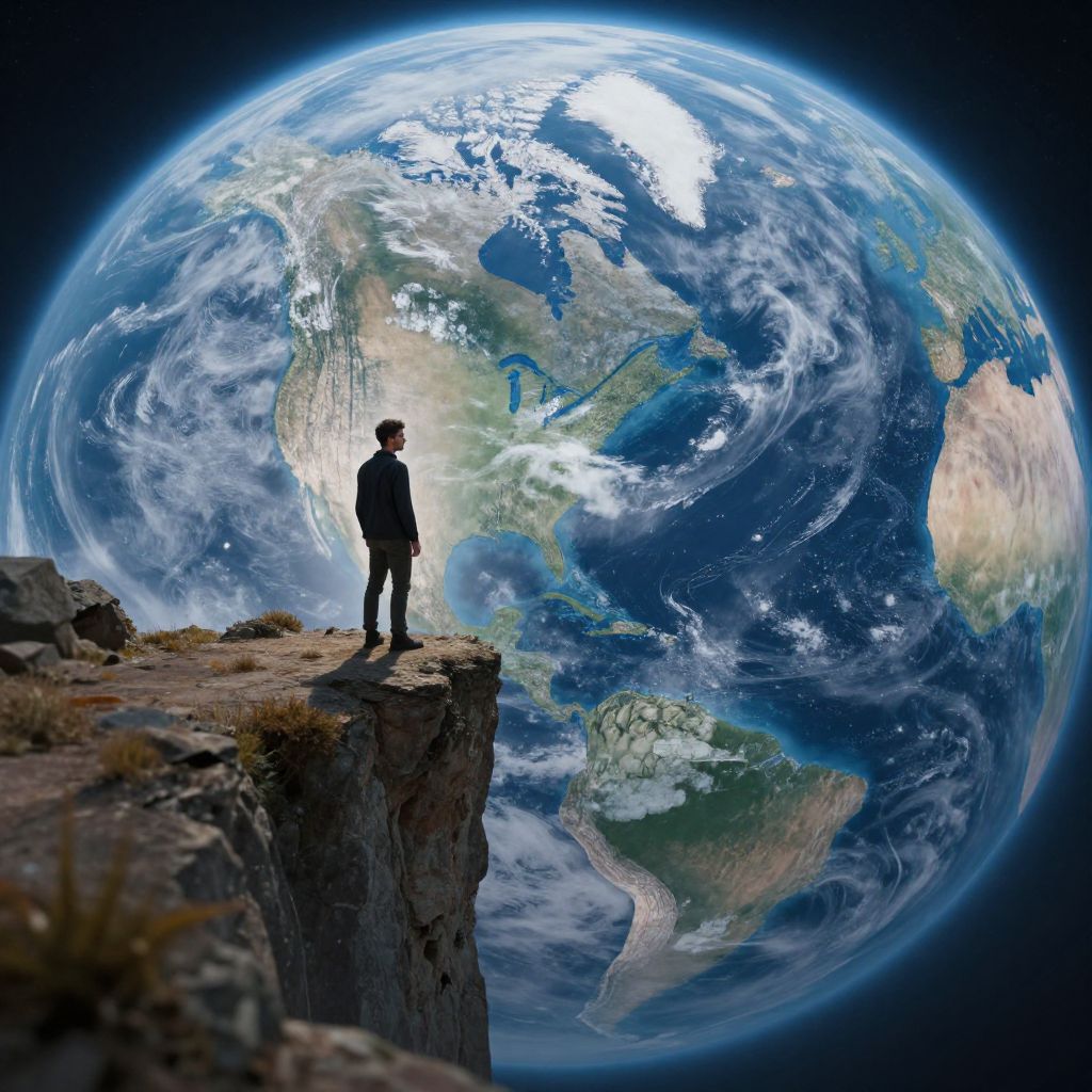 Photograph-like digital artwork depicting a small, dark-suited figure standing on a rocky cliff edge, gazing at a massive, detailed globe of Earth in space. The Earth fills the background, showcasing vibrant blue oceans, green and brown landmasses, white clouds, and swirling atmospheric patterns. The cliff is textured with rocks and sparse vegetation. The figure, silhouetted against the bright Earth, conveys a sense of smallness and wonder. The overall style blends realistic and surreal elements, emphasizing the contrast between human size and planetary scale.