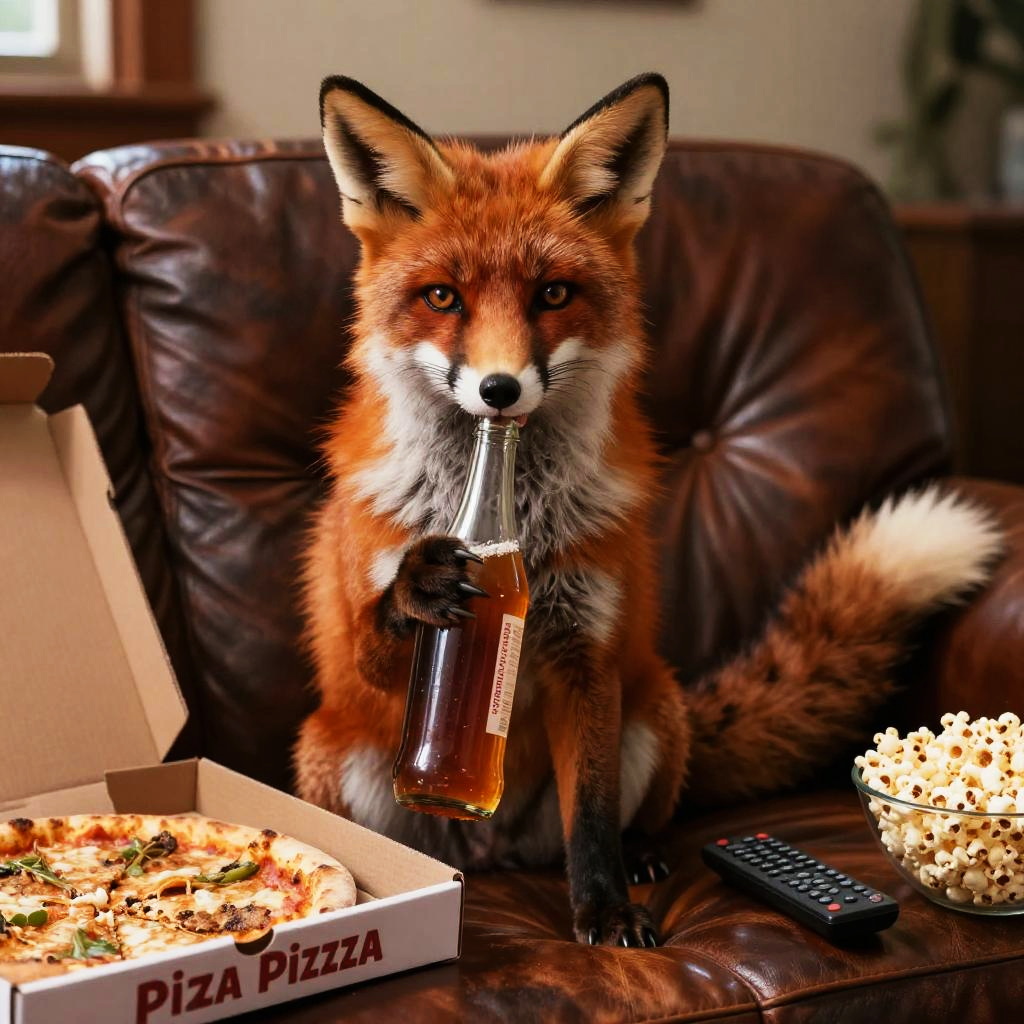 Anthropomorphic red fox, scruffy red-orange fur, bushy white-tipped tail sitting on a well-loved leather couch, holding a glass bottle and a TV remote control, sipping from the bottle, looking directly at the viewer with a playful smirk, open pizza box and a bowl of popcorn on the side table