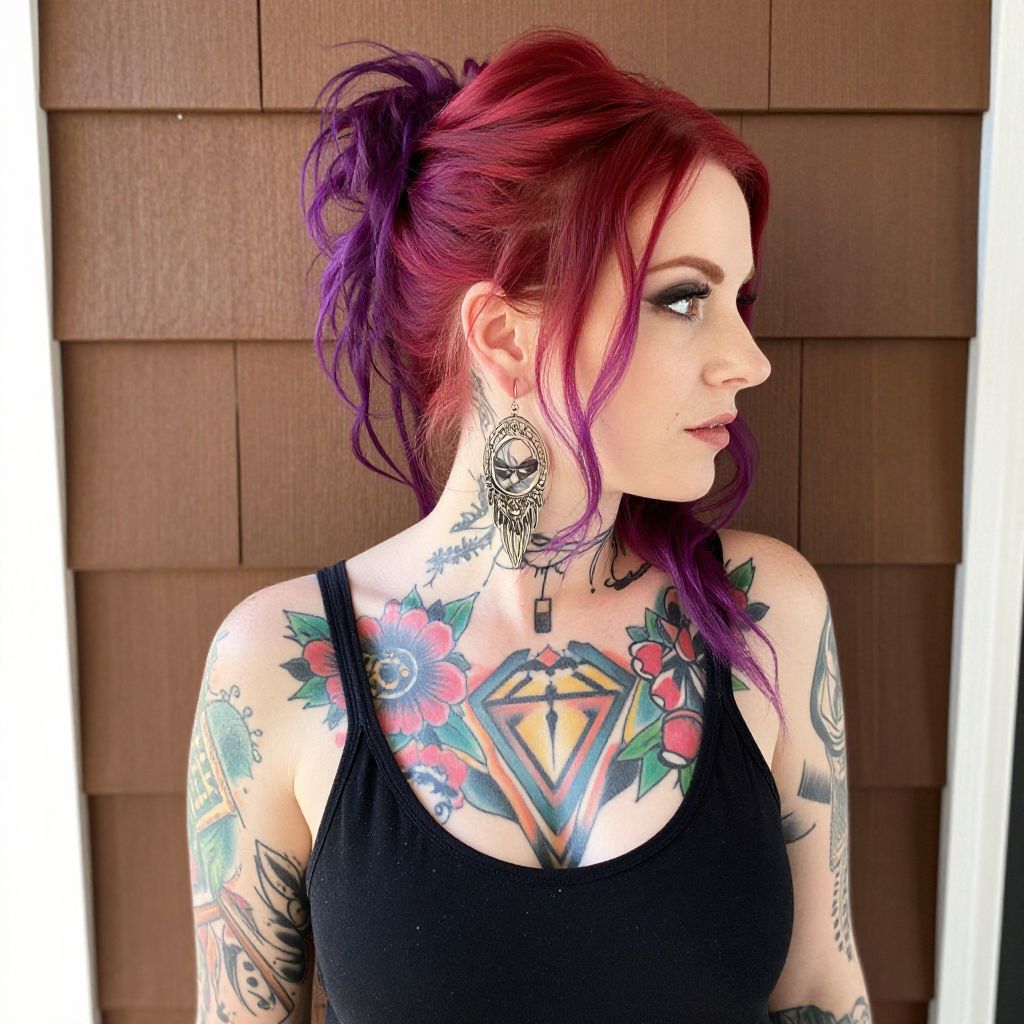 Photograph of a pale-skinned woman with vibrant red and purple hair styled in a messy updo. She's facing to the right, showing off extensive tattoos covering her chest, arms, and neck. Her tattoos feature colorful designs like flowers, hearts, and geometric patterns. She's wearing a black sleeveless top and large, intricate earrings. The background has a wooden shingle wall, adding texture. The lighting is bright, creating a high-contrast effect.
