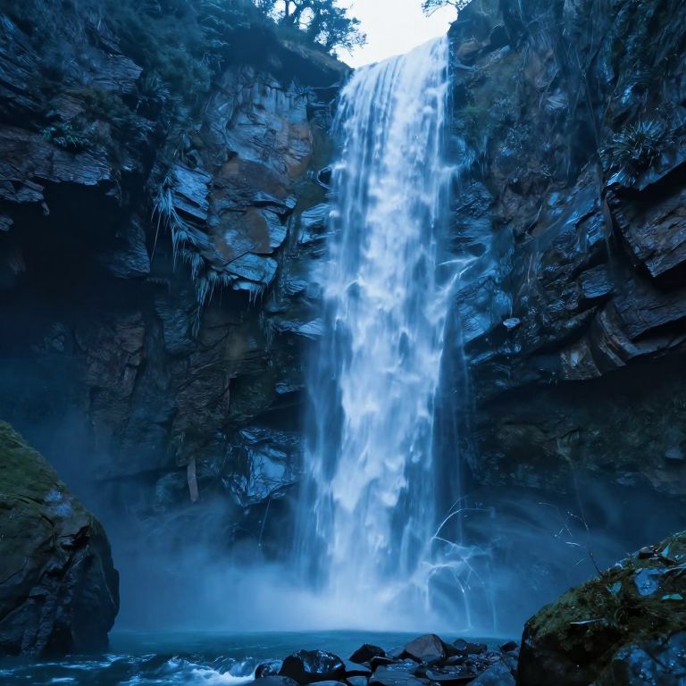 Photograph of a powerful, blue-tinged waterfall cascading down a dark, rocky cliff surrounded by mist and lush greenery.