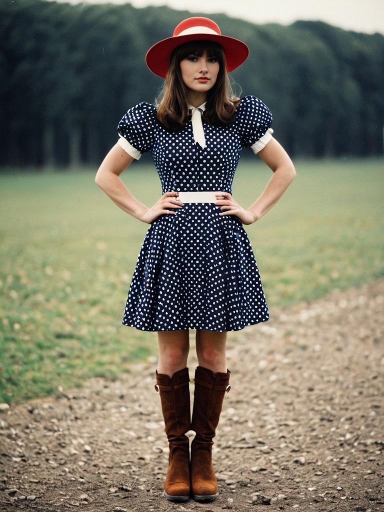 Polka dot costume, dress, boots, polka dot dress, polka dot, blurry, blurry background, brown footwear, looking at viewer, full body, standing, solo focus, fashion, crossdressing, 1girl, hat, male focus