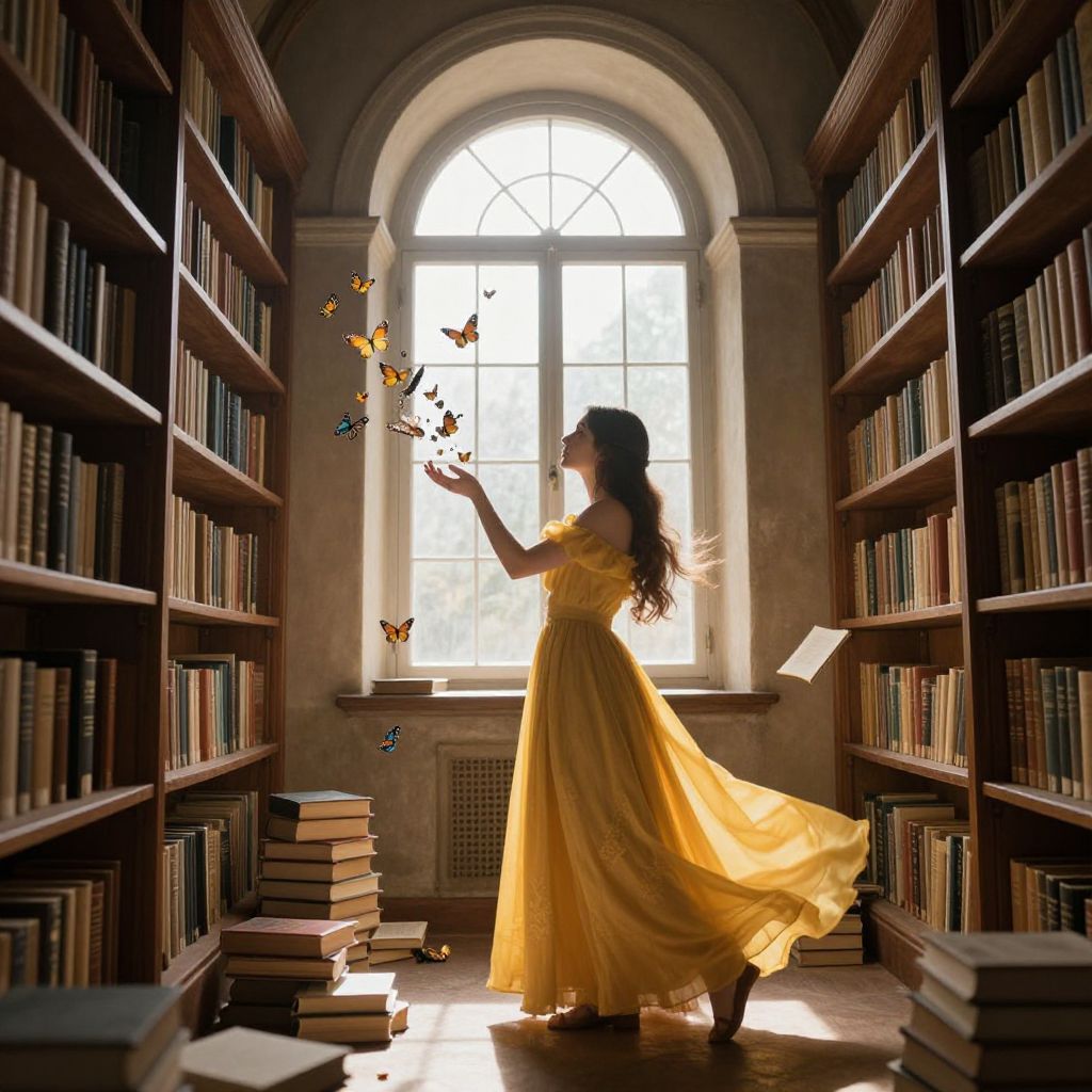 Sunlight streams through an arched window in an ancient library, illuminating a woman in a flowing yellow dress as she stands amidst shelves of books, her outstretched hand releasing a cascade of butterflies that dance among the scattered volumes, each book and butterfly hinting at stories waiting to be discovered.