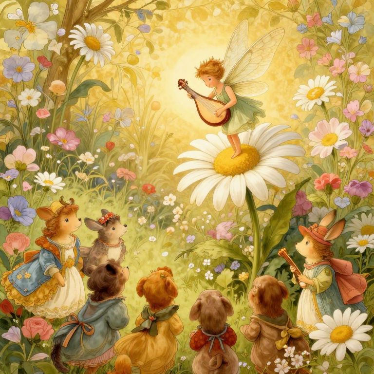 Whimsical fairy painting: six adorable animal children in vintage dresses gather around a fairy playing a lute amidst a vibrant, sunlit meadow of