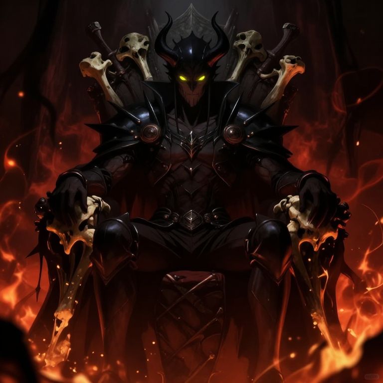 Digital artwork of a dark, imposing figure seated on a throne amidst fiery orange flames. The figure, with glowing yellow eyes, wears black, spiked armor and a horned helmet. Two skulls rest on its shoulders, and its gloved hands grip the throne's arms. The background is a dark, smoky void, enhancing the ominous atmosphere. The figure's chest is adorned with intricate, metallic designs. The overall style is dark fantasy, with a focus on gothic and demonic themes, characterized by sharp contrasts and dramatic lighting.