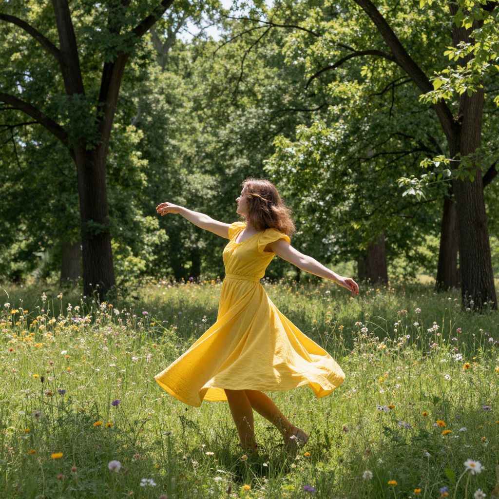 A woman in a flowing yellow dress twirls joyfully amidst a vibrant meadow of wildflowers, her arms outstretched as sunlight filters through the dappled canopy of towering trees, casting ethereal shadows that dance in harmony with the gentle breeze.