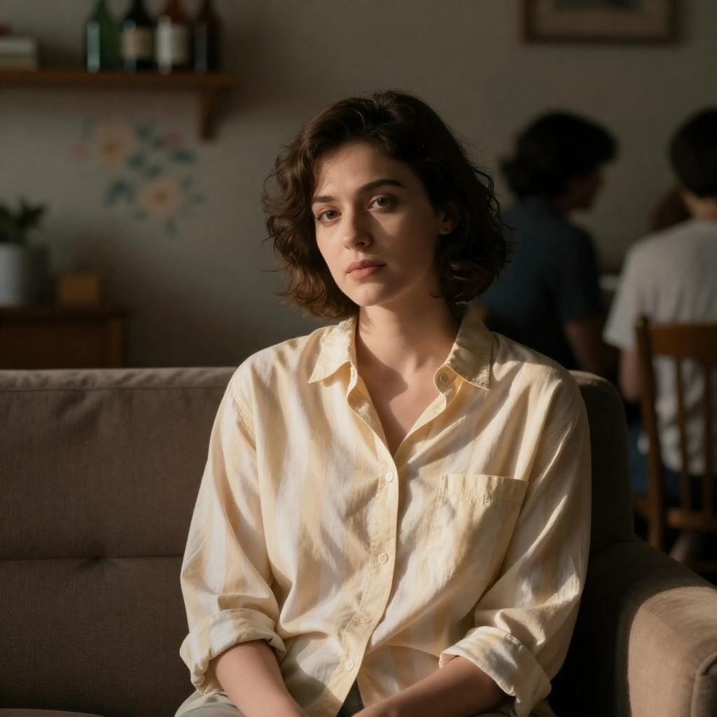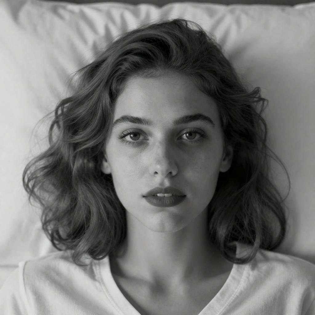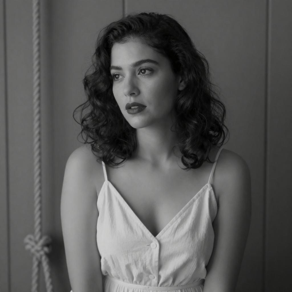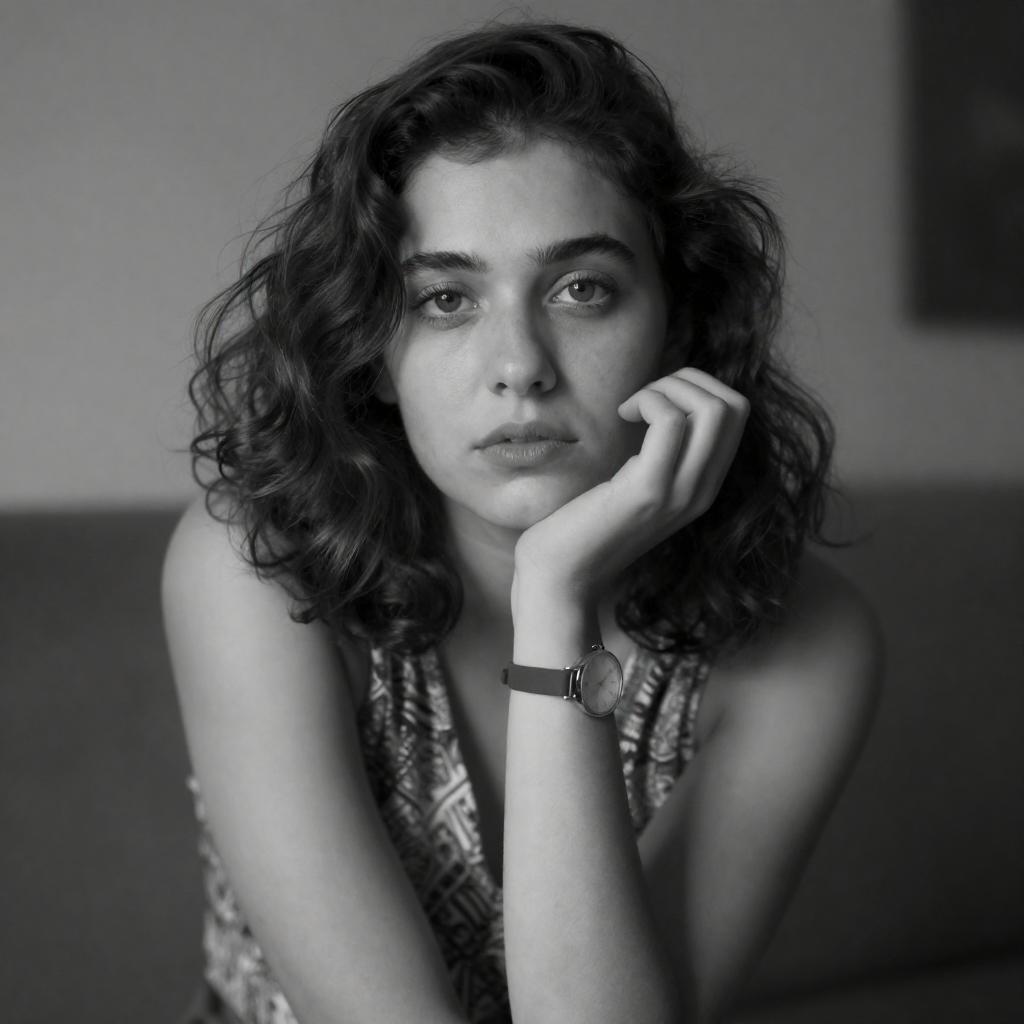 Black-and-white photograph of a woman with wavy, dark hair, wearing a plaid shirt, holding a bouquet of flowers. She gazes intently at the camera, with soft light highlighting her face and creating shadows. Her right arm rests on a surface, and the bouquet is positioned in her left hand.
