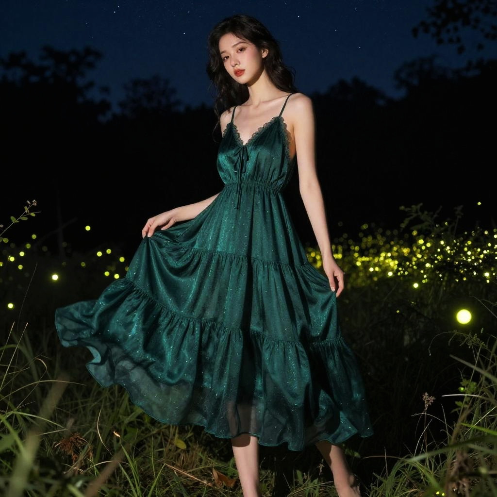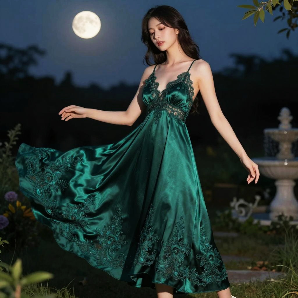 Emerald green night gown flowing elegantly on a graceful woman, silky fabric shimmering under soft moonlight, intricate lace details, dreamy romantic atmosphere, evening garden background