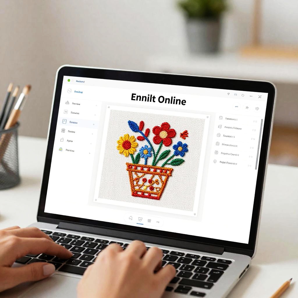 Embroidery effect online, user interface of a digital embroidery design software, showing colorful stitched patterns on screen, sleek UI with editing tools, creative workspace vibe, soft focus on hands working on design