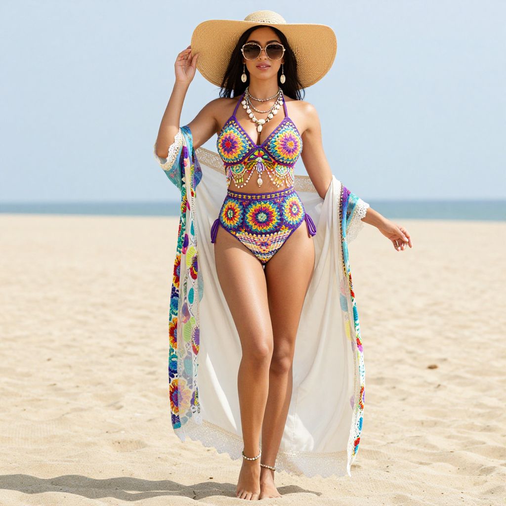 Full body shot, tall woman, vibrant crochet swimwear, intricate floral patterns, multicolored yarn, high-waisted bikini bottom, halter neck top, lightweight cover-up, sheer beach kimono, flowing sleeves, delicate lace trim, layered beach jewelry, seashell necklace, beaded anklets, oversized straw hat, wide-brimmed, oversized sunglasses, sun-kissed skin, sandy beach backdrop, bright sunlight Sexy. Pretty face and beаutiful eyes. Big breasts