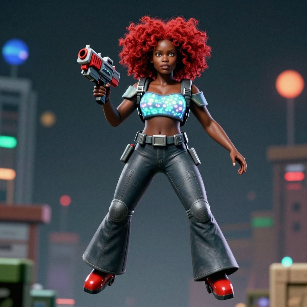 Photorealistic digital illustration of a Black woman with vibrant red curly hair, mid-air against a cityscape at night. She wears a blue, glow-in-the-dark crop top and black, high-waisted, flared jeans with red platform shoes. Her right hand grips a futuristic, red and white gun. The background features blurred, colorful city lights and buildings. Her expression is determined, and she has a lean, athletic build. The overall style is dynamic and action-oriented, with a strong emphasis on her confident, heroic stance.