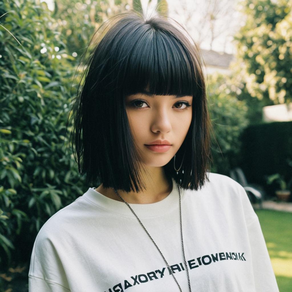 Fringe Cut hairstyle on fashion model, wearing modern streetwear, in garden, captured in fashion editorial style with soft daylight.