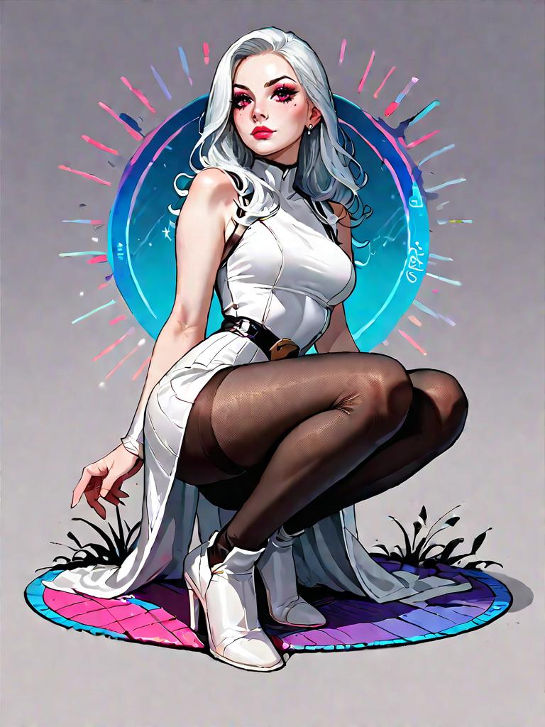 1girl, source_comics, realistic face, full body shot, Woman, chic, bodycon white dress, mesh neckline, sleeveless racerback style, knee-length, paired with a metallic structured clutch.
