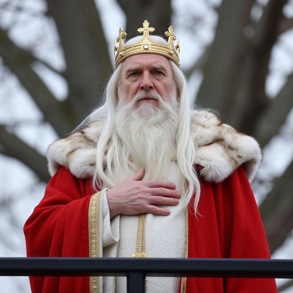 Photograph of an older white man with a long, flowing white beard and long white hair, wearing a golden crown and a red robe with a fur-lined cape. He's standing outdoors against a backdrop of leafless trees, with his right hand gently resting on his chest. His expression is serious and regal. The black railing in the foreground adds depth to the image.