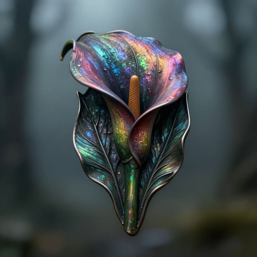 Metal trinket depicting a Calla lilyMeredith Marsone, natural, shimmering, vibrant, gothic, rpg, 1400ad, ultra detailed, detailed, immersive, reminiscent of high fantasy RPG games, HD, masterpiece, best quality, hyper detailed, super realistic, perfect face, perfect hands, award-winning, professional, breathtaking, linquiveramagic Coastlinemelancholy weathercinematic photo . 35mm photograph, film, bokeh, 4k