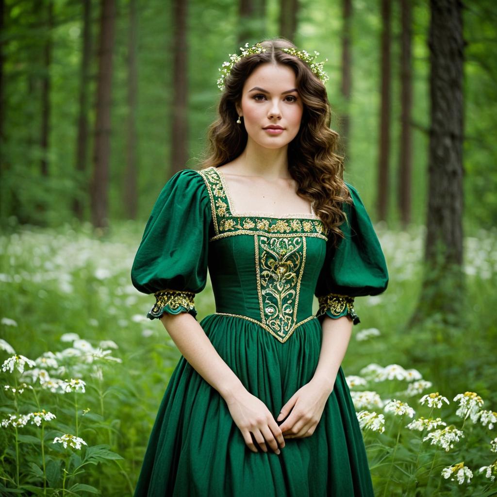 Cheeky costume, photograph of a young woman standing on a dirt forest path, wearing a colorful Renaissance-style dress with purple, pink, and turquoise panels, floral embroidery, off-the-shoulder sleeves, floral headband, long wavy brown hair, fair skin, soft natural light, lush greenery in the background, trees with sunlight filtering through, casual realistic style, bohemian fairy tale vibe, summer forest setting